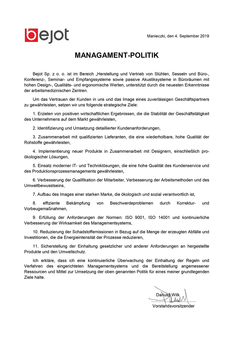 Um unsere Informationspflicht gemäß Art. 11 der Datenschutz-Grundverordnung vom 18 Mai 2018 (Gesetzblatt 2018, Pos. 1000) zu erfüllen, möchten wir Sie darüber informieren, dass unser Datenschutzbeauftragten Frau Monika Zygmunt-Jakuć ist, an die Sie an die Korrespondenzadresse des Verantwortlichen, d.h. Bejot sp. z o.o., ul. Wybickiego 2a, Manieczki, 63-112 Brodnica k. Poznania oder E-Mail-Adresse: iod@bejot.com.pl wenden können.