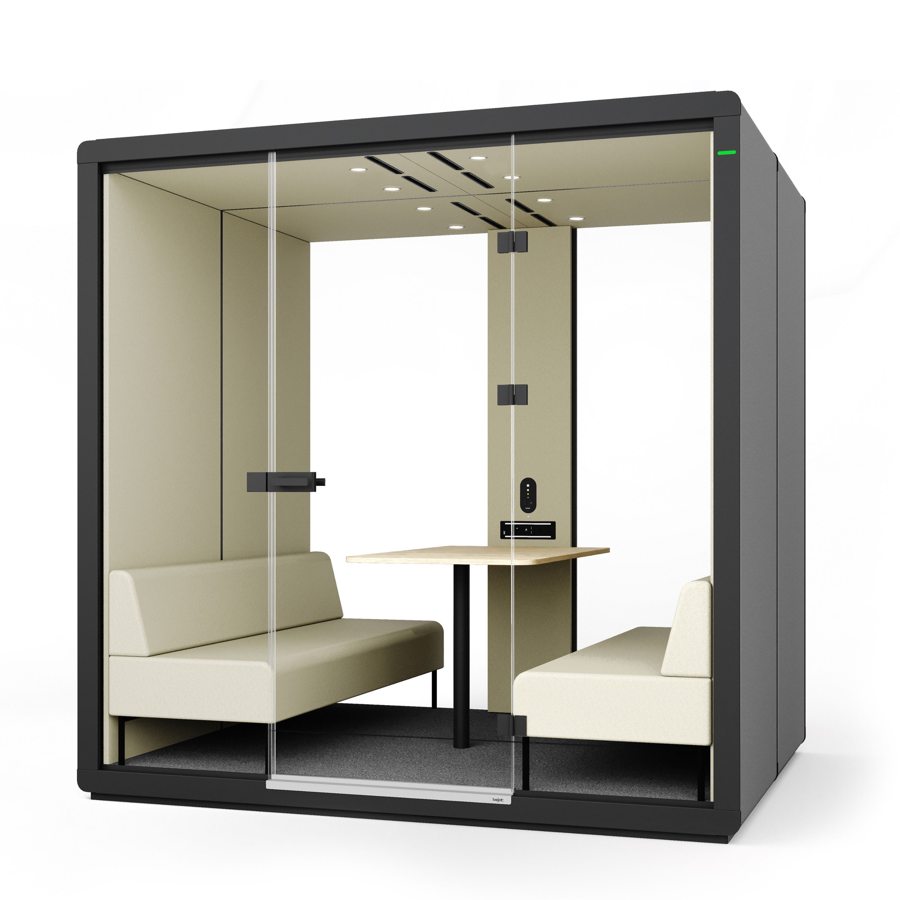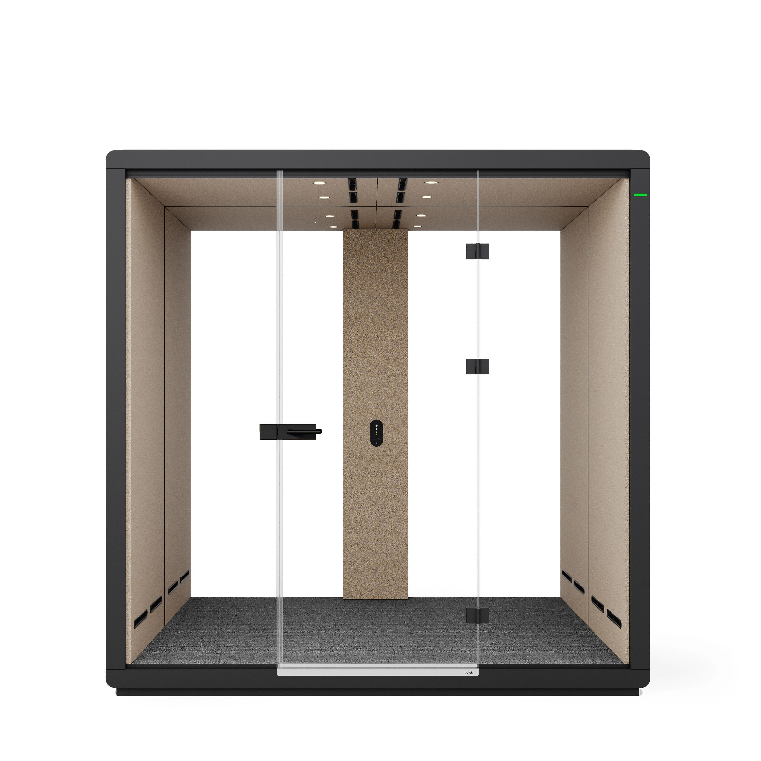 Die Flathouse-Kabine ist mit einem intuitiven Touch-Bedienfeld ausgestattet, mit dem die Benutzer die Innenraumbedingungen leicht an ihre individuellen Bedürfnisse anpassen können. Über das eingebaute Bedienfeld können Beleuchtung und Belüftung präzise gesteuert werden, so dass die Atmosphäre im Inneren der Kabine vollständig angepasst werden kann. Die Möglichkeit, sowohl die Lichtintensität als auch den Luftstrom fein einzustellen, gibt den Benutzern die vollständige Kontrolle über ihre Umgebung. Diese Lösung erhöht nicht nur den Komfort, sondern ermöglicht auch eine bessere Anpassung des Raums an die Art der anstehenden Aufgabe.
