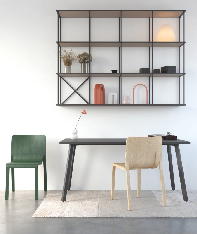 A system of industrial shelves with a geometric construction that can be varied with seats, shelves and other accessories. These elements change the function of the furniture, giving it a unique form.