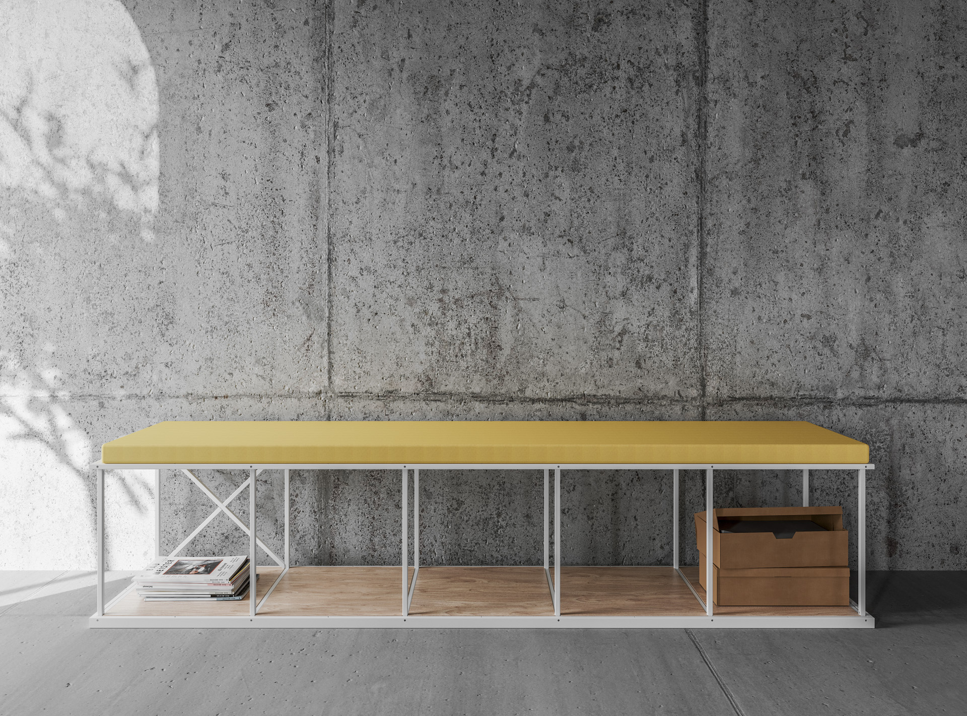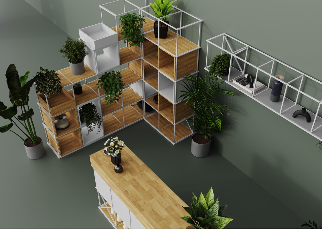 A system of industrial shelves with a geometric construction that can be varied with seats, shelves and other accessories. These elements change the function of the furniture, giving it a unique form.