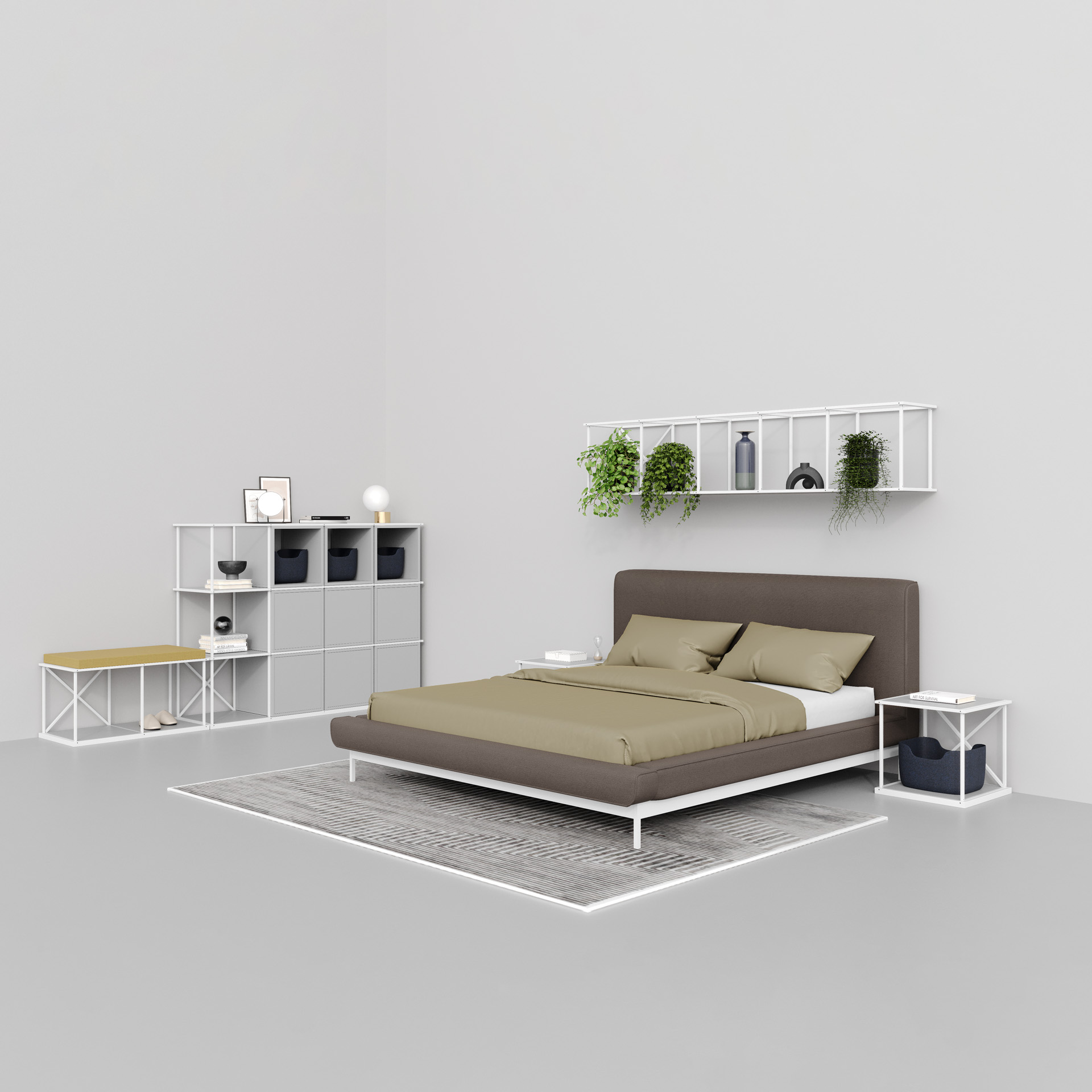 A modular, functional shelving system with a steel structure. Each shelving unit can be customised with a unique size and shape. Additional accessories like shelves, lockable cabinets, hangers and seats make the Saar system truly multifunctional. The shelving can be hung on a wall or used to divide an open space, build a counter and much more.