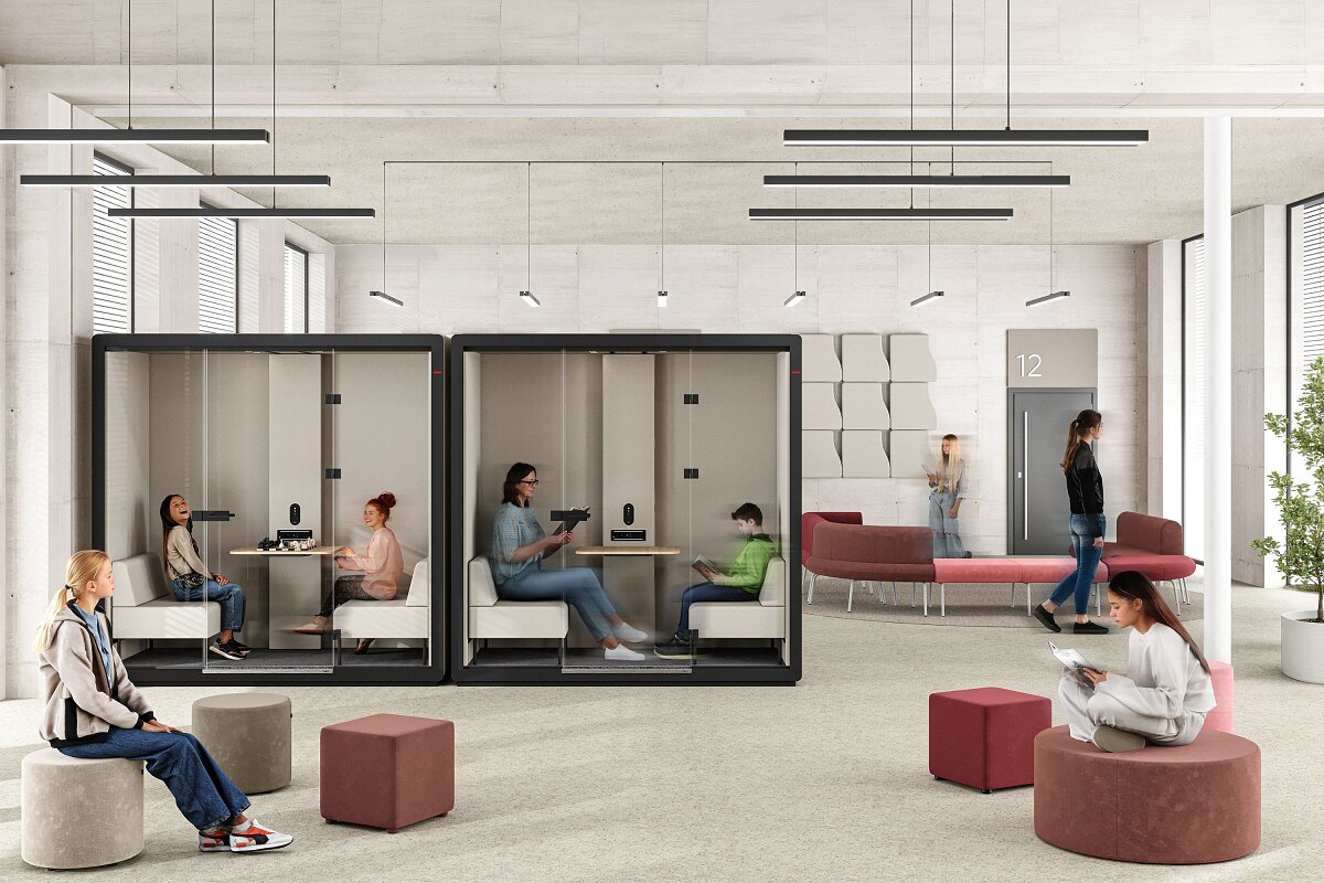Noise in these common areas can be distracting and stressful. Choosing appropriate acoustic solutions improves comfort for both students and teachers. A practical arrangement of these spaces can be achieved with modular furniture, which is especially useful in areas that are difficult to plan, such as around pillars or irregular walls.