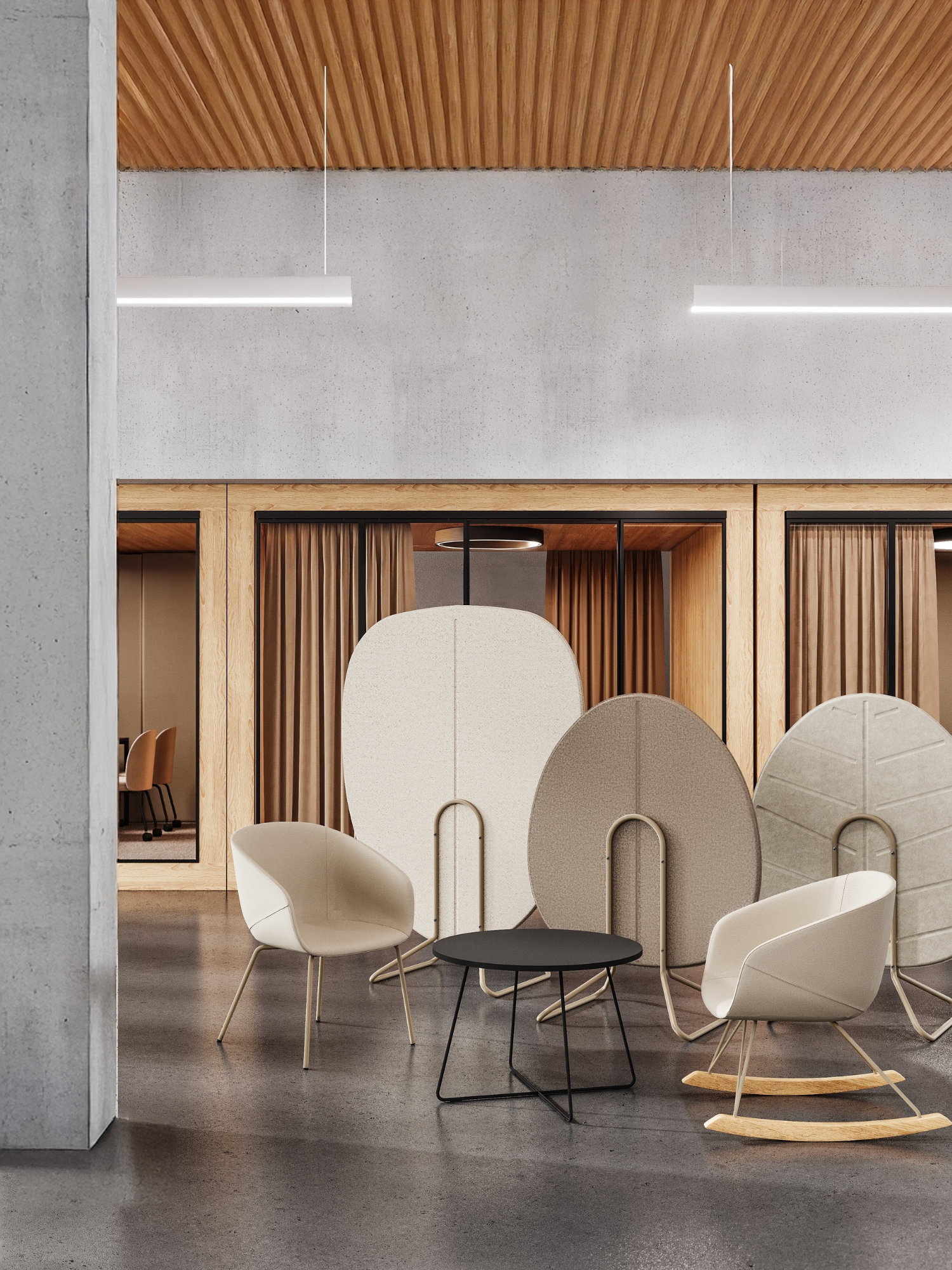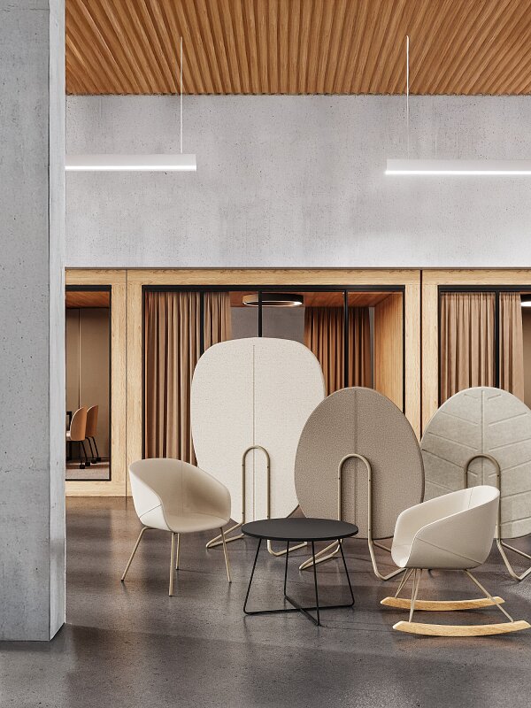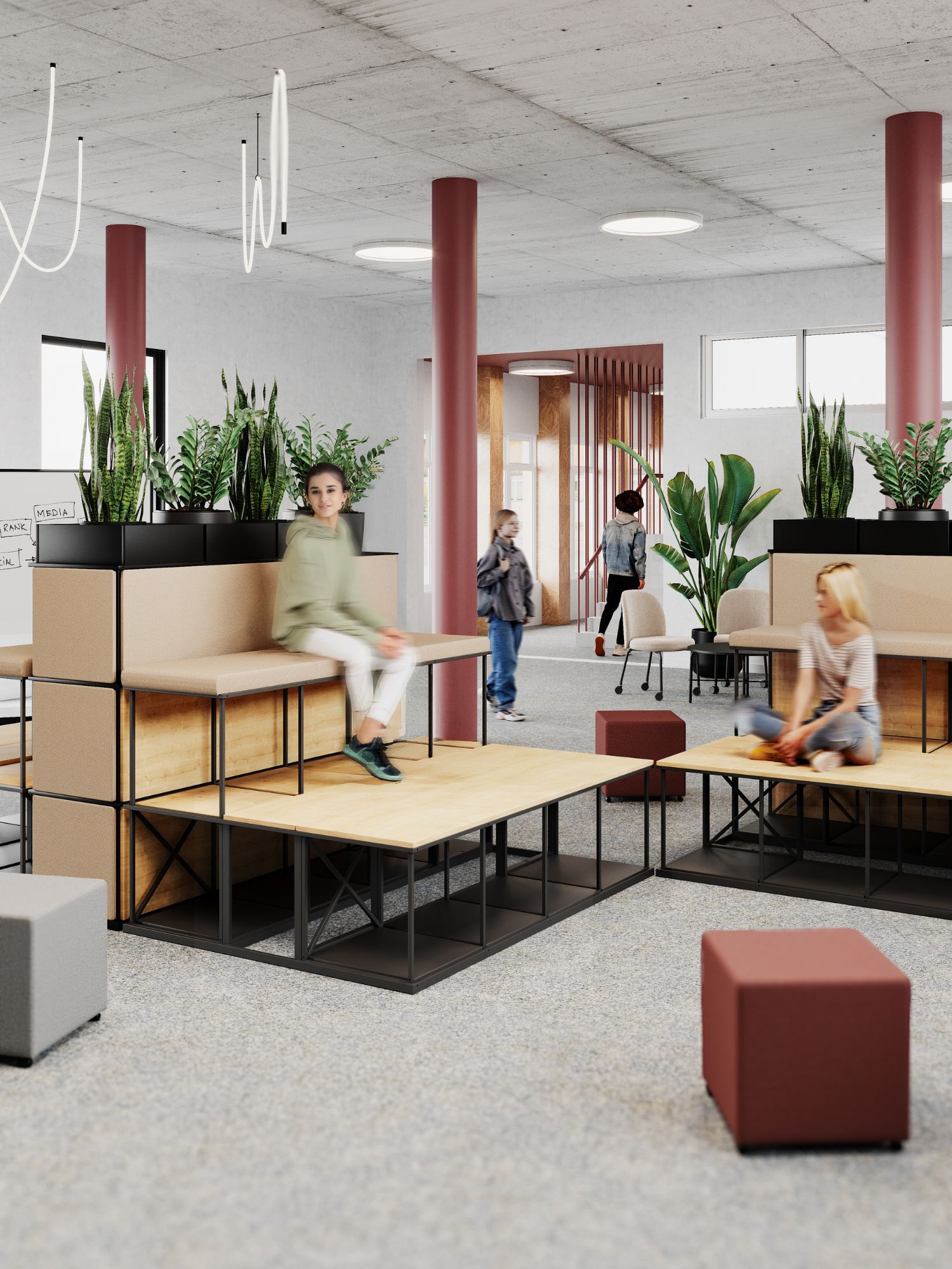 In school relaxation zones for students and teachers, silence and comfort are essential. Good acoustics and comfortable, soft furniture allow everyone to rest and recharge between lessons. Biophilic elements, such as plants and natural materials, support a connection with nature and enhance well-being. The overall space should promote wellness, focus, and the restoration of energy for learning and work.
