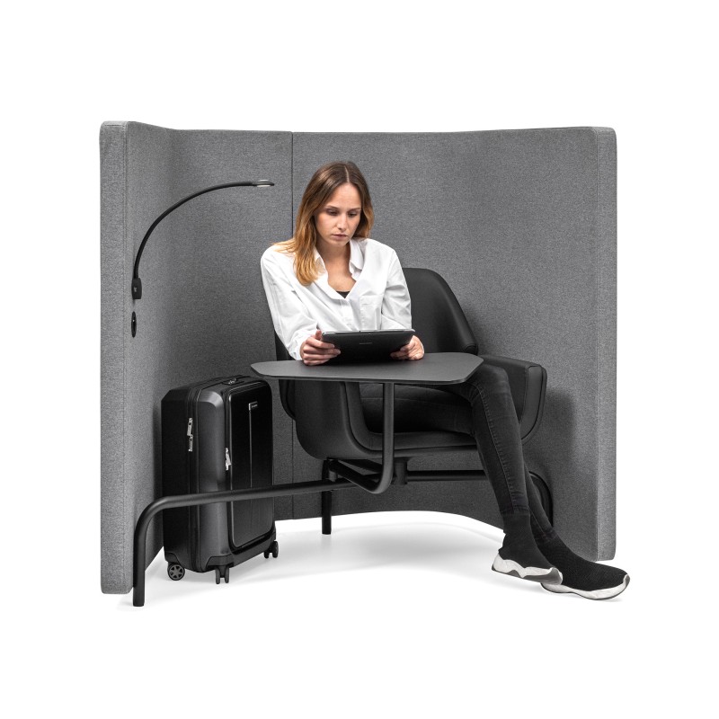 Un meuble acoustique compact doté d'un siège confortable, d'une isolation acoustique, d'un éclairage à faible consommation d'énergie et d'un plateau de table mobile.La forme arrondie de la paroi acoustique, qui entoure l'utilisateur sur presque tous les côtés, protège du bruit tout en offrant confort et commodité.