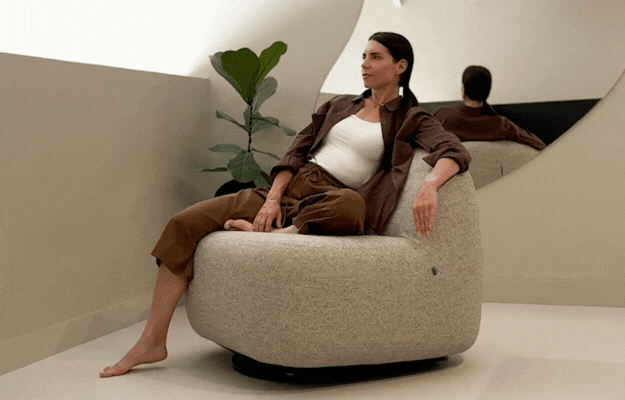 Funkcja bujania oraz mechanizm obrotowy wprowadzają naturalną dynamikę, sprzyjając koncentracji, odprężeniu i dobremu samopoczuciu użytkowników. Obła forma kolekcji bezpośrednio przekłada się na komfort. Zastosowanie pianek i sprężyn kieszeniowych zapewnia wygodę nawet podczas dłuższego użytkowania, wspierając ideę wellbeing w różnorodnych codziennych przestrzeniach.