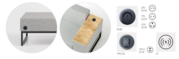 mediaporty mogą być zamontowane do siedzisk i podłokietników z blatem; do wyboru 2 rodzaje mediaportów: 1 x 230V lub 2 x USB